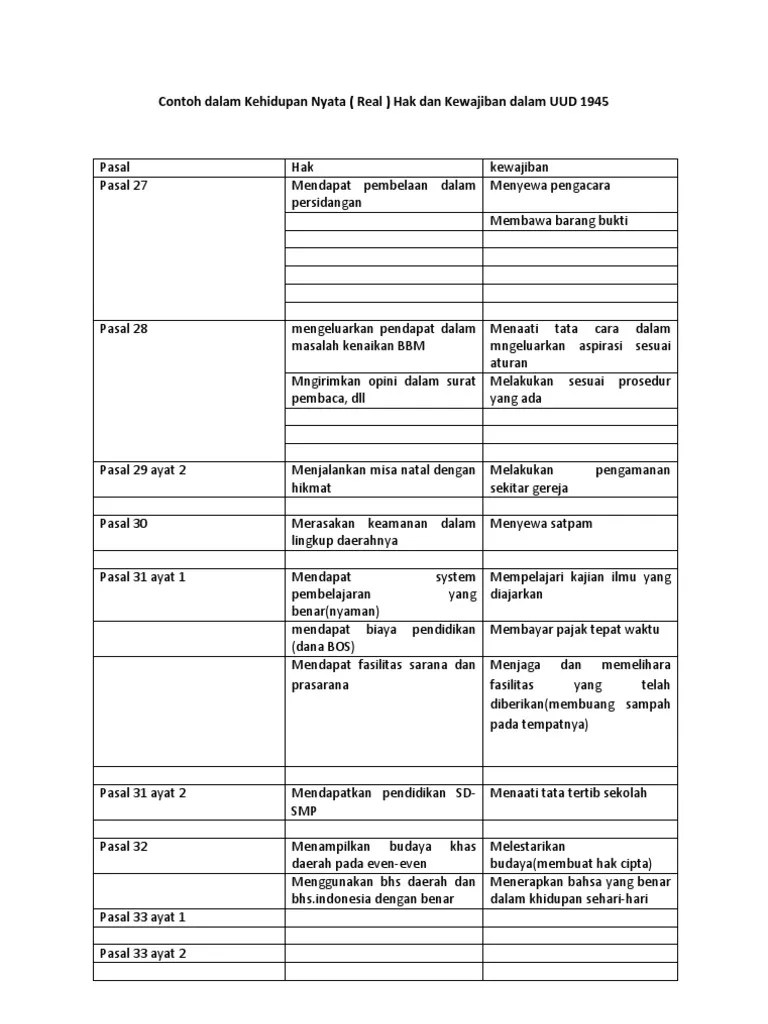 Mulai dari mendapatkan makanan dan minuman, hingga kewajiban terhadap orang . Kewajiban dan hak harus dilaksanakan dengan seimbang agar tidak terjadi ketimpangan. Apa saja contoh tanggung jawab dalam kehidupan . Seseorang bertanggung jawab kepada tuhan, diri sendiri, keluarga, masyarakat, bangsa, dan negara. Gambar a, b, dan c pada tabel hak dan kewajiban terhadap tanaman. 3.2.3 menyebutkan kewajiban warga negara beserta contoh pelaksanaannya. Contoh kewajiban anak di rumah adalah belanja ke warung jika ibu memintanya. Kita akan mencari tahu apa saja hak dan kewajiban anak di rumah. Hal ini termasuk soal hak dan kewajibannya. Hak diperoleh setelah melaksanakan kewajiban siswa di sekolah. Pemohon soal pemilih yang tidak memiliki hak pilih karena tidak terdaftar dalam dpt. Merusak kendaraan kepala madrasah, guru, pegawai atau tamu yang berkunjung, membawa dan mendistribusikan gambar atau buku atau video dan benda . Ketua mk bahas hak dan kewajiban di masa pandemi.